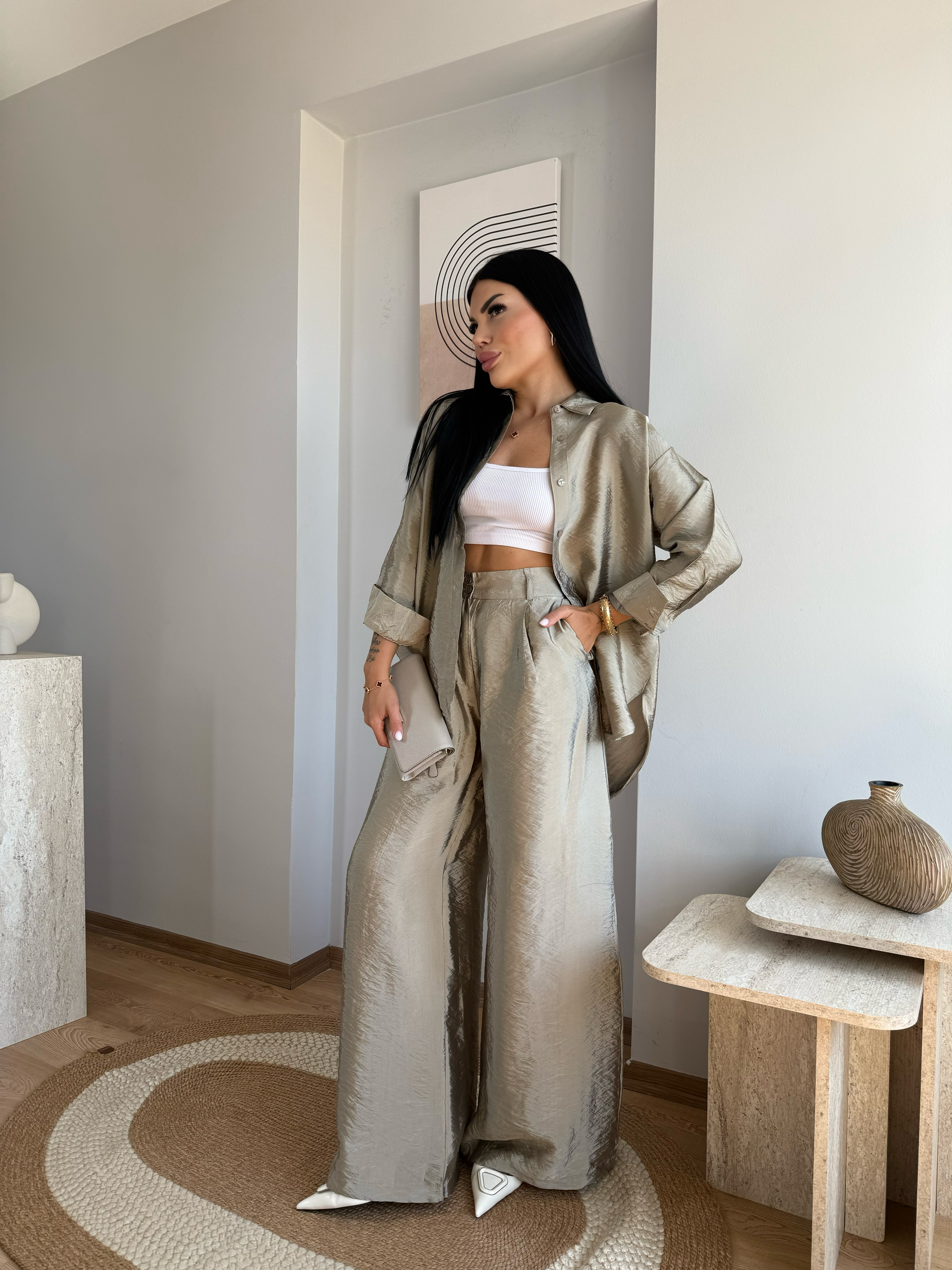BEJ RENK PARLAK GÖMLEK PALAZZO TAKIM