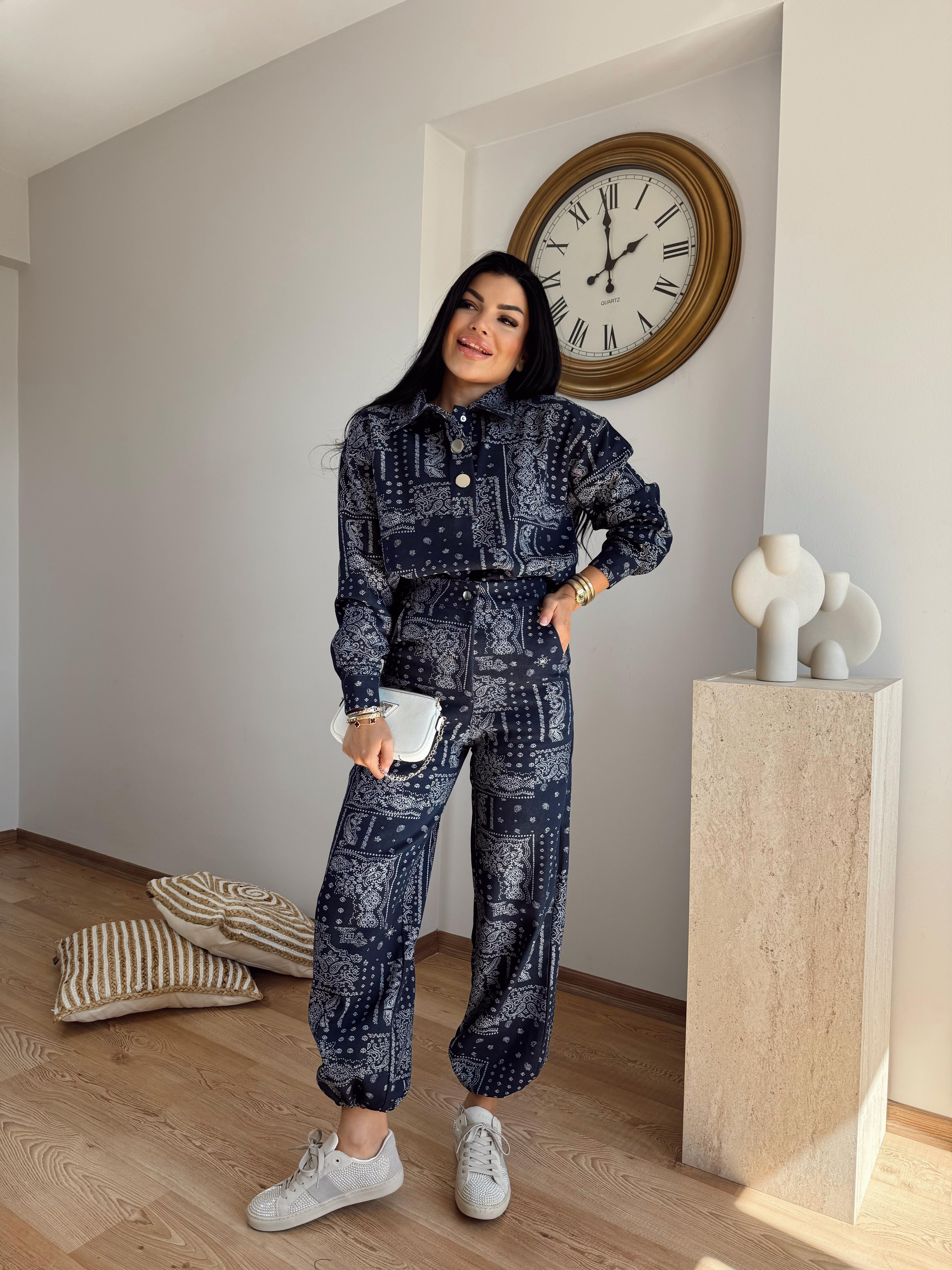 DESENLİ LASTİK DETAYLI JEAN TAKIM