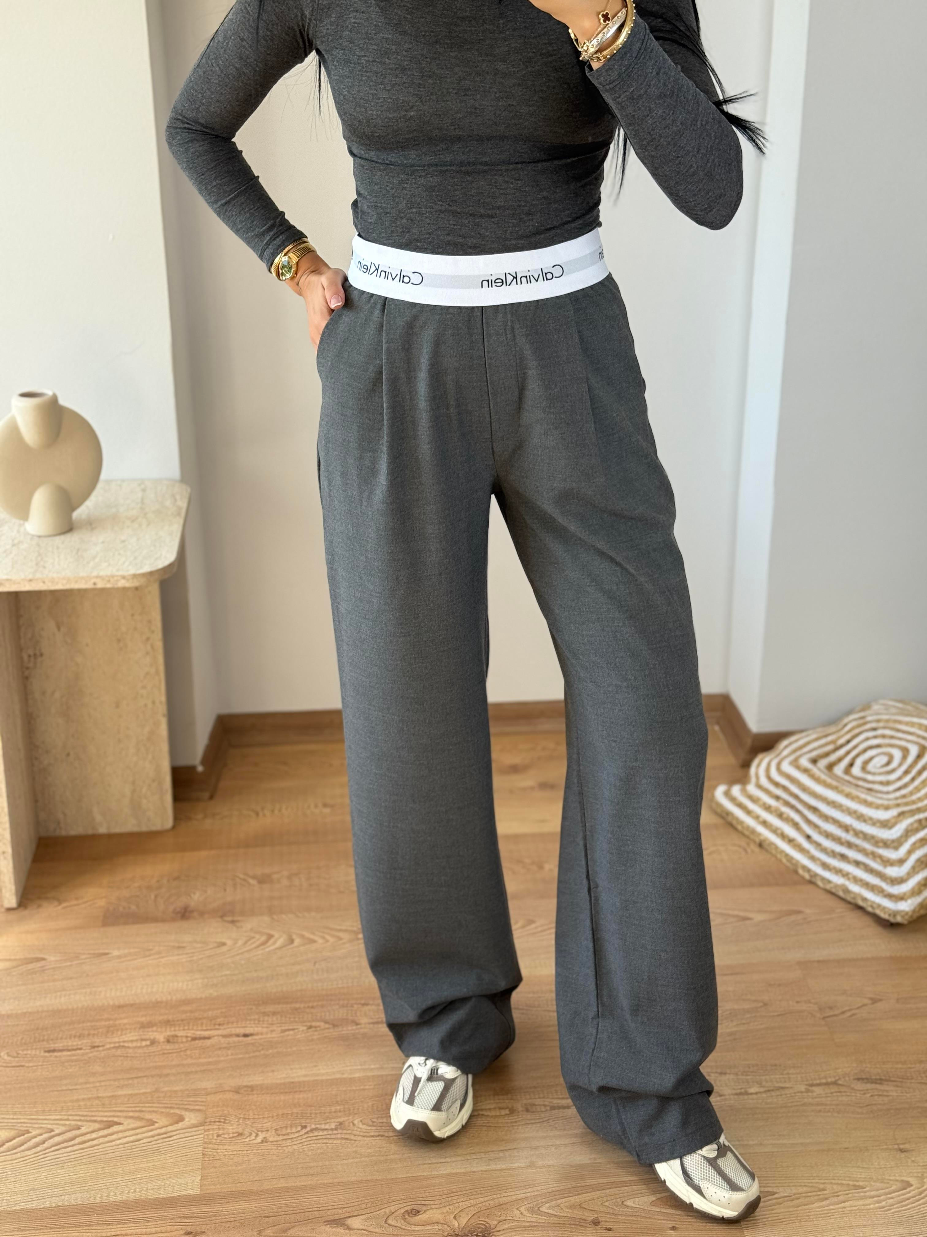 Gri bel lastikli detaylı pantolon palazzo