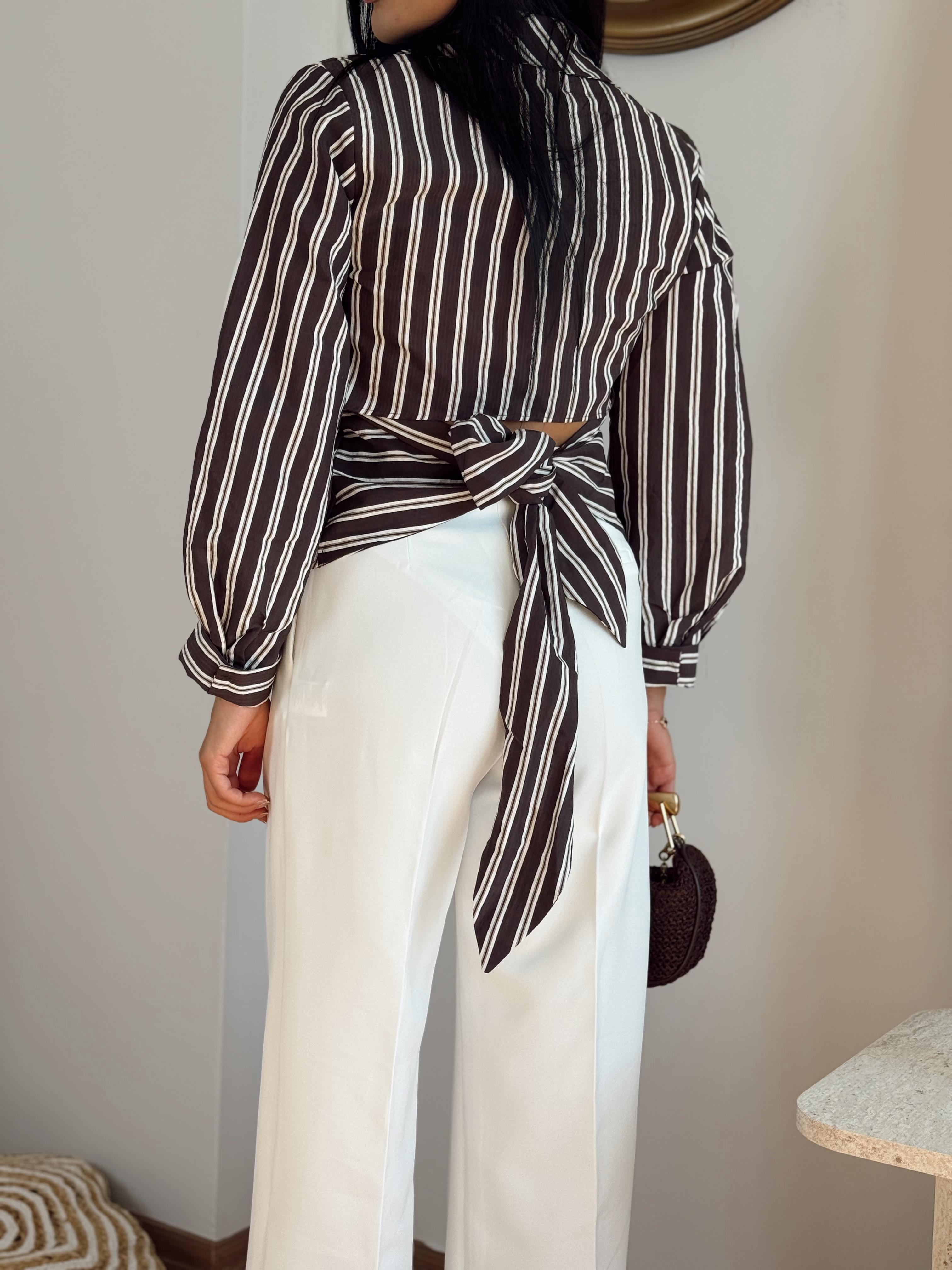 KAHVE BEYAZ ÇİZGİLİ SIRT BAĞLAMA GÖMLEK