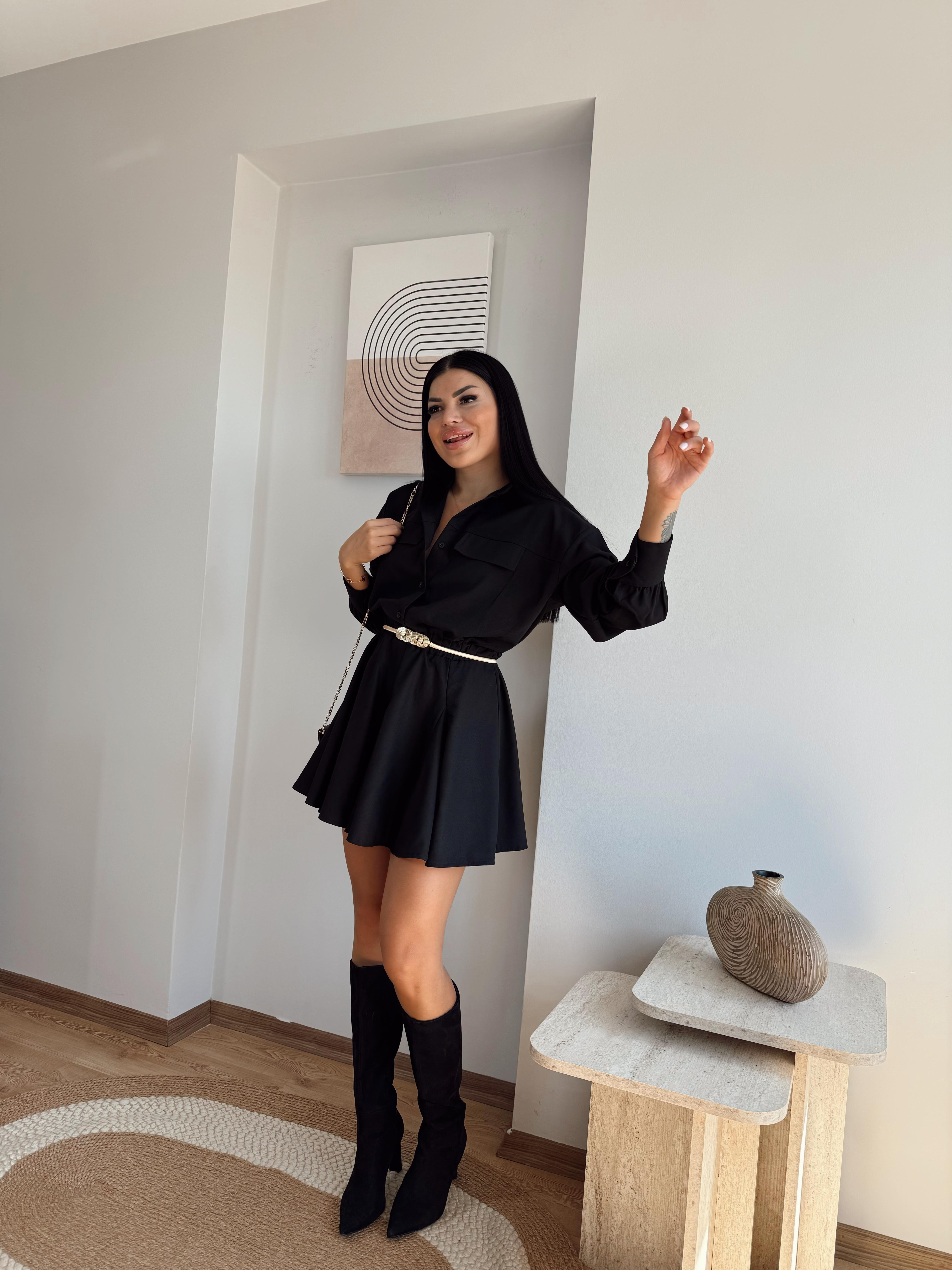 SİYAH BEL LASTİKLİ VOLANLI ELBİSE (KIŞLIK KUMAŞ)