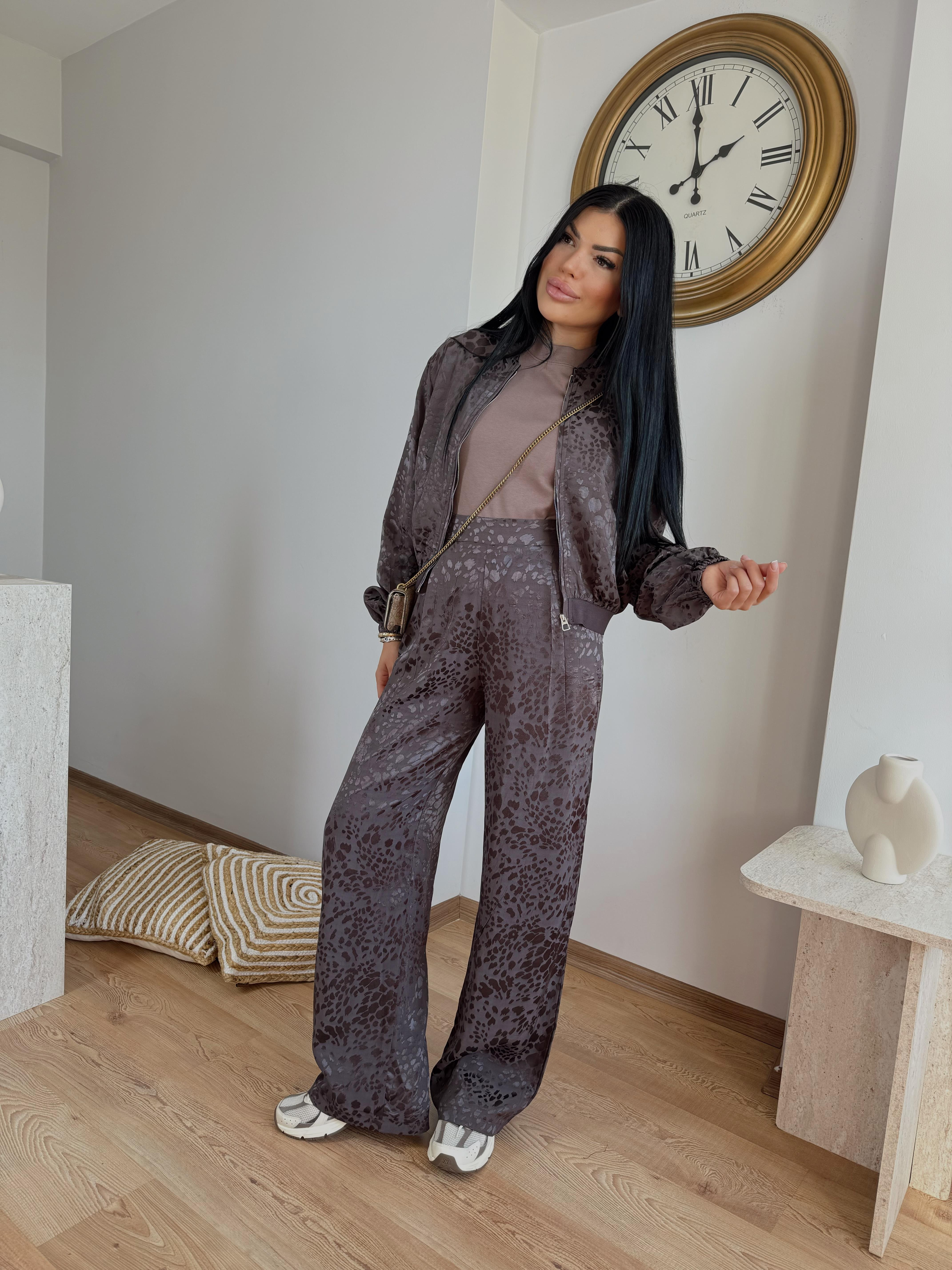 KAHVE SATEN DESENLİ BOMBER CEKET PALAZZO TAKIM